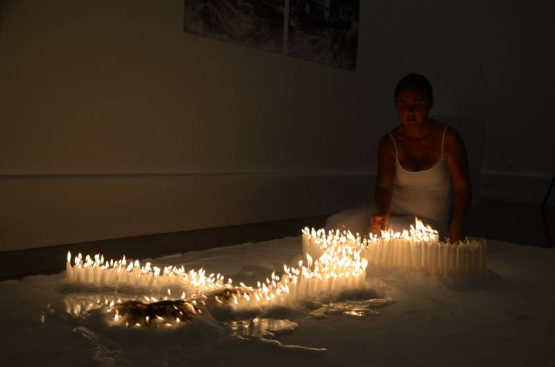 Na performance, a artista sugere que um corpo miscigenado morreu num conflito político. Vemos a artista deitada sobre a tela, sendo desenhada por uma pessoa convidada a desenhá-la na tela. O “corpo-alma” da artista levanta para fazer seu próprio ritual. Vestida de branco, ao som de atabaques, rememora curas afro-brasileiras e indígenas, ritualizando a partir de seu próprio corpo desenhado simbolicamente à beira mar para apresentar os ancestrais que morreram no mar. Um rastro azul surge quase ao final da performance como índice da presença do mar, a cor é diluída pela água. O calor e cor das velas acesas suscitam almas da ancestralidade e remete ao calor das incorporações.