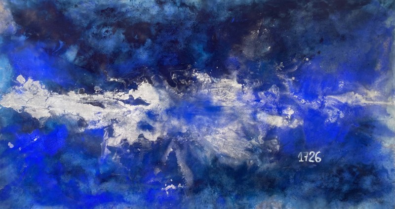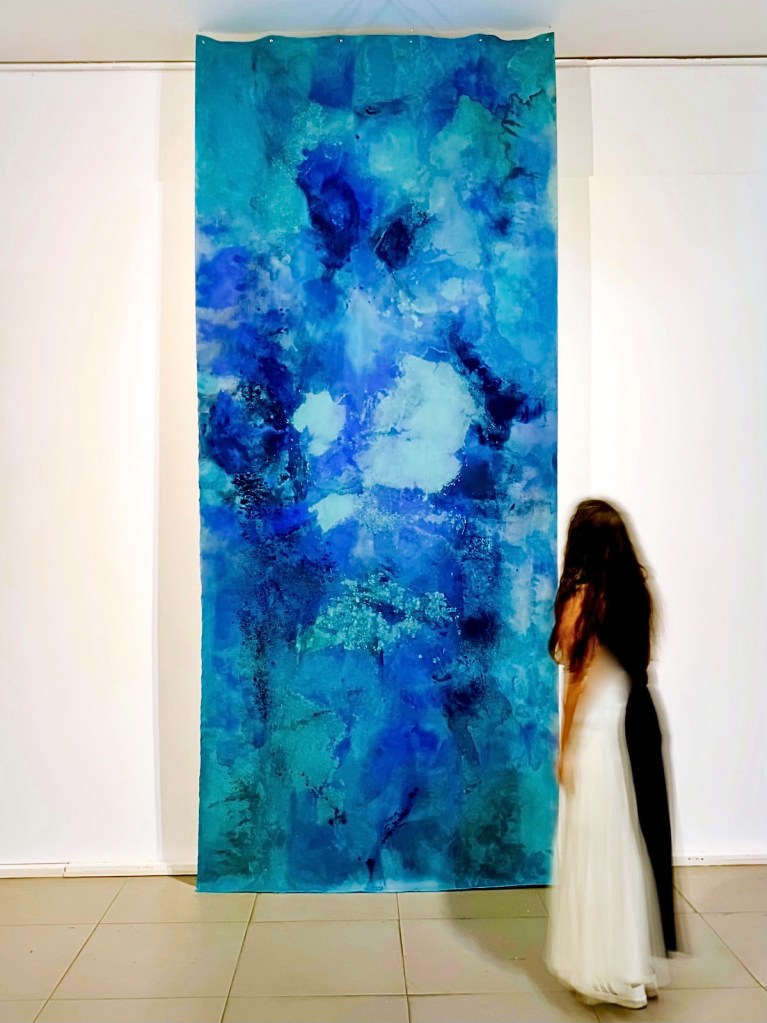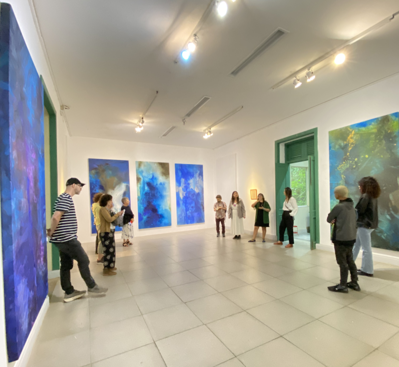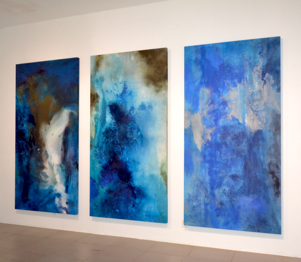 Temos uma série de pinturas das águas salgadas e dos ancestrais desencarnados no Atlântico. Pigmentos regados por muita água, vão adensando as camadas. Esse “fundo do mar” tenta apresentar um rastro da tragédia da travessia do Atlântico. Não só os corpos de milhões desencarnados durante a escravização, mas também antigos parentes que morreram no mar, na travessia do Atlântico. Com diversas camadas de água, diversos tipos de pigmentos azuis, e pequenas porções de pigmento branco, verde, ocre ou lilás, as cores vão se sobrepondo em poças de água, se misturam, involuntariamente formam índices de rostos diversos.