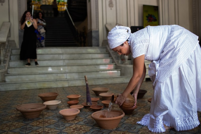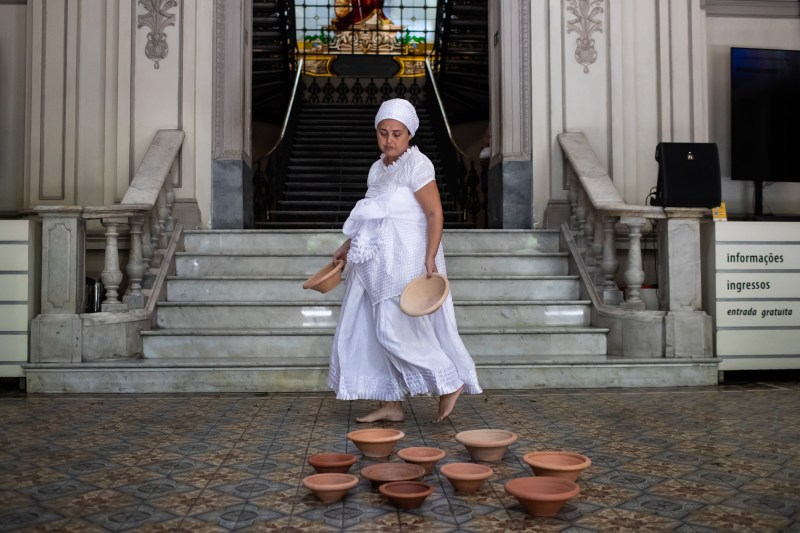 As performers caminham pela exposição e saem do espaço expositivo, encontrando a instalação, montada previamente pela artista Luanda, em frente ao casarão do espaço de arte Abapirá. Enquanto ocorre a ação ouvimos um áudio previamente gravado em estúdio, no qual a artista traz melodias cantadas a capela até iniciar a interpretação da poesia. Temos o som do mar que atravessa todo áudio até a chegada do samba “Viva as Almas!”. Na ação, as artistas apresentam uma Preta Velha e um Preto Velho , gotas de cera das velas são derramadas num alguidar, arrudas são ofertadas ao público junto a reflexão sobre a tragédia da escravização e a forte cultura africana que se espalhou por todo território brasileiro.