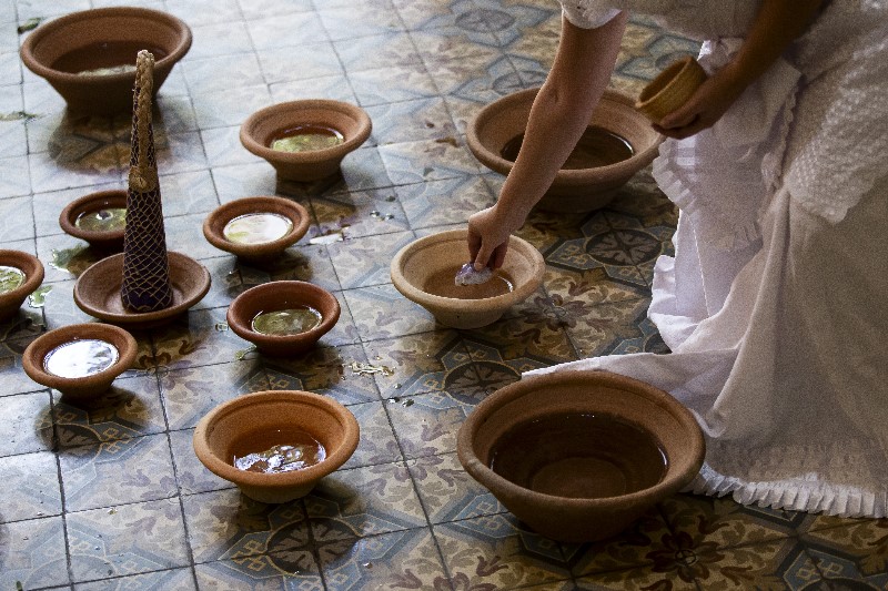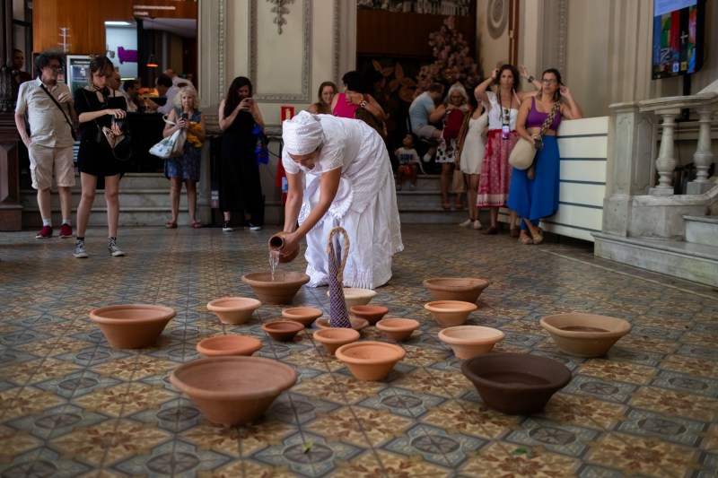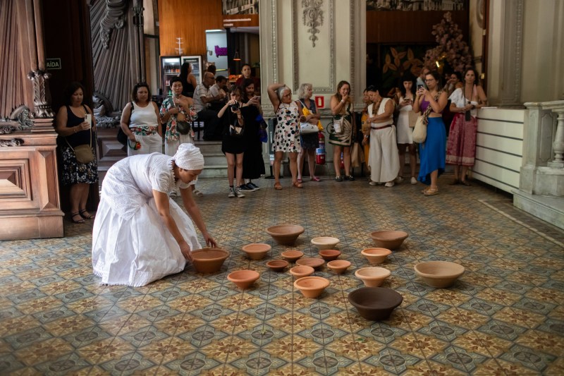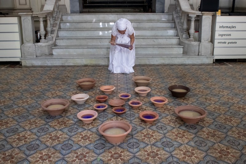 Idealização e performer Luanda | performer convidada Preta Evelin | esteiras de taboa, banquinhos de Pretos Velhos, alguidar com cera de velas branca preta e vermelha, prato de cerâmica, vaso de cerâmica, arrudas, figurino branco, terços brancos, bengala de galho de árvore e chapéu de palha | poesia da artista “Cada Gota de Cera é uma Lágrima do Passado”, música “Viva as Almas!” de autoria da artista | Citações às heranças africanas das Pretas e Pretos Velhos da Umbanda |O roteiro de som foi elaborado pela artista Luanda, com a poesia “Cada Gota de Cera é uma Lágrima do Passado” junto ao som do mar e trechos das músicas “Viva as Almas! “e outras músicas de herança africana em domínio público | duração da performance 21 minutos.