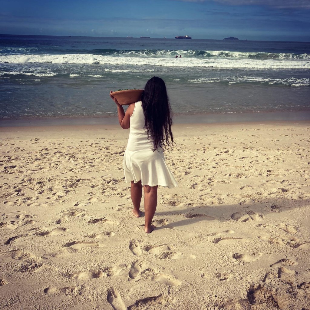 Tenho trilhado esse caminho. Vou ao mar. Levo oferenda. Passam dias. Vou ao mar. Levo oferenda. De manhã cedo, vou ao mar. Levo oferenda. Na areia úmida, vou ao mar. Levo oferenda. Eu vou lá, areia, sal e mar, levo oferenda. É o que sempre desenho. Ninguém vê. Mas eu posso fazer qualquer traço, que todo gesto que há, o mar está lá. O vestido branco, a flor azul, é areia, é areia, é areia. Todos os meus caminhos são de areia e mar, terra e água. Todo vai e vem são ondas do mar. Todo peixe é de Yemanjá. Todo fundo do mar é de Nanã.